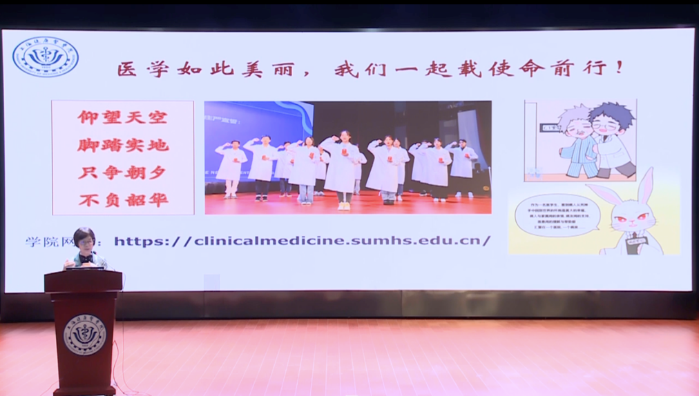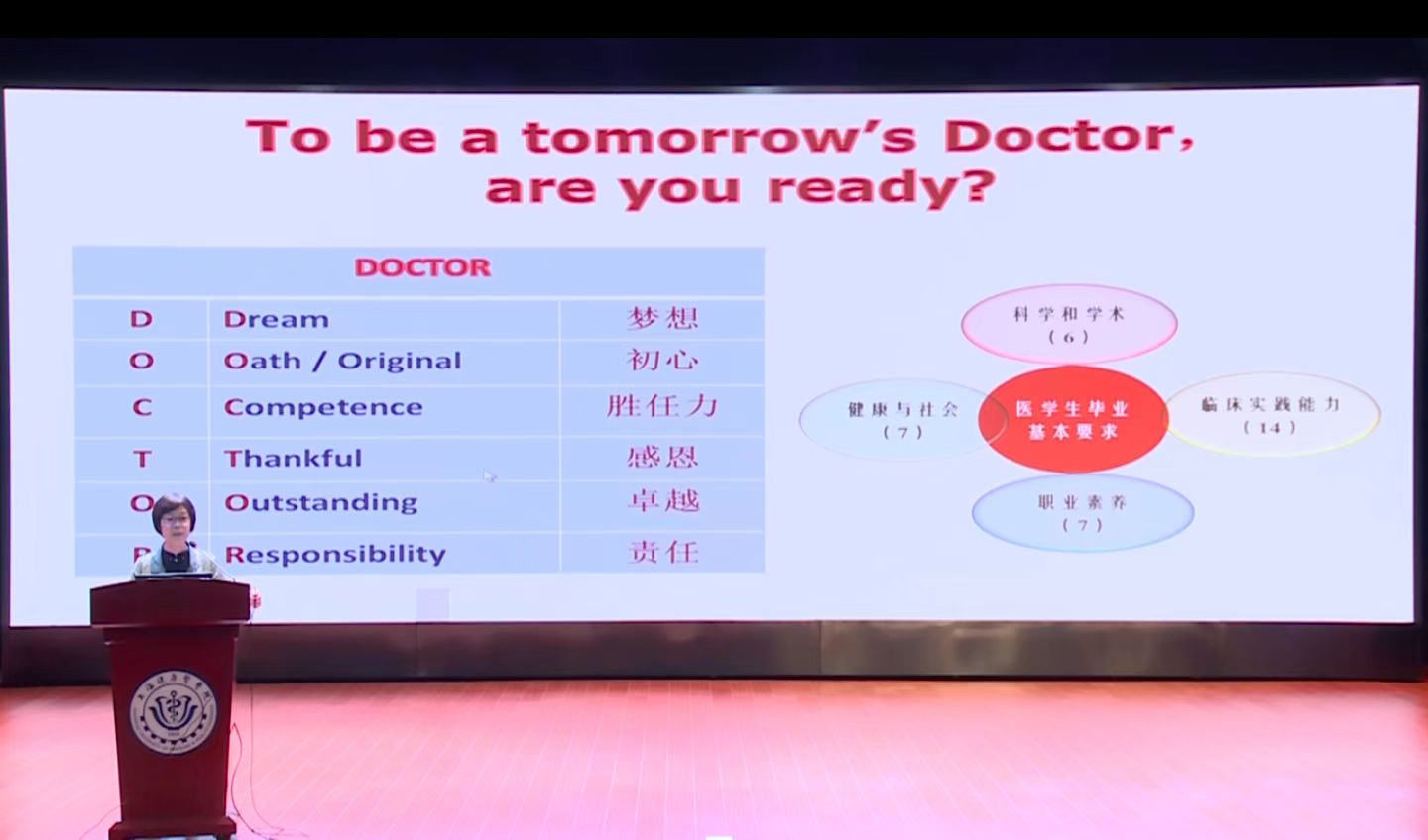 最后,蔡院长通过医学生誓言,表达了对新生同学们的殷切期望。用DOCTOR寄语2022年级医学生们。D(Dream),要有梦想和追求;O(Oath),要坚守医学誓言;C(Competence),练就未来服务于病人的胜任力;T(Thankful),要有感恩之心;O(Outstanding)不断追求卓越;R(Responsibility),担起维护健康的责任(Responsibility)和使命。希望同学们能够不忘初心,成为有责任、有担当、人民满意的健康守门人。