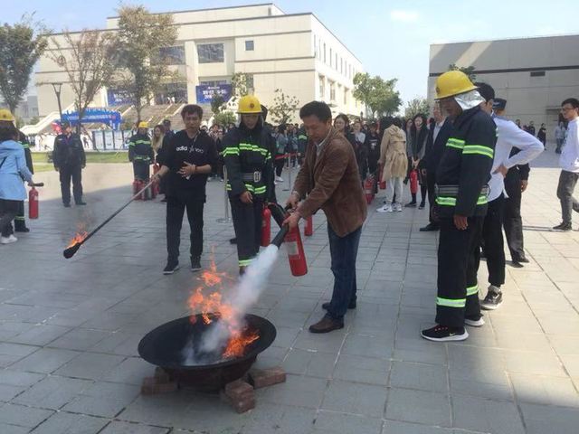 保卫处为保障此次活动的顺利进行,聘请了周浦消防中队的指导员,讲解如何预防火灾,以及发生火灾的情况下,同学们以何种态度面对和如何正确逃生。紧接着,为了模拟火灾现场,保卫处老师在走廊与教室中放入了烟雾弹。火灾警报声响起时,同学们用毛巾捂住口鼻,穿过浓厚的烟雾,切身体验了火灾逃生的真实情景,感受到了逃生时的紧迫感和危机感。最后,在南苑教学楼前,老师与同学们在消防员的指导下,掌握了灭火器的使用方法,自己拿起灭火器,扑灭了火盆。
