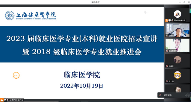 10月19日,我院通过腾讯会议线上召开2023 届临床医学专业(本科)就业医院招录宣讲暨就业推进会。临床医学院党总支副书记罗瑾琰、2018级学生辅导员吴单、瑞金医院全科医学科童健菁主任和第六人民医院人力资源部张丽萍主任、18级临床本科实习生参加会议。