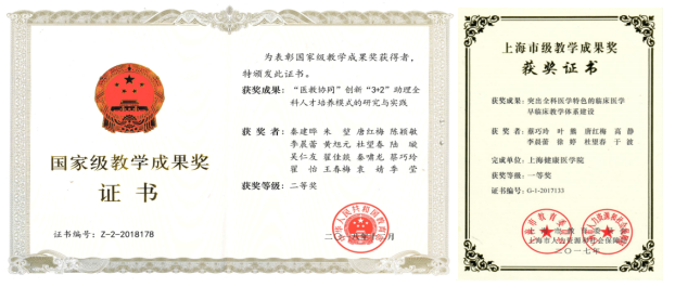 作为上海市课程思政领航学院,教学探索获得了“突出全科医学特色的临床医学早临床教学体系建设”获上海市级教学成果一等奖;“‘医教协同’创新‘3+2’助理全科人才培养模式的研究与实践”获国家级教学成果二等奖;