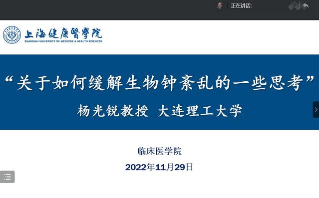 11月29日晚,临床医学院举办线上学术交流活动,大连理工大学生物工程学院副院长杨光锐教授做了题为“关于如何缓解生物钟紊乱的一些思考”的学术讲座,我校教师及研究生共计40余人参加并学习。会议由临床医学院院长蔡巧玲教授主持。