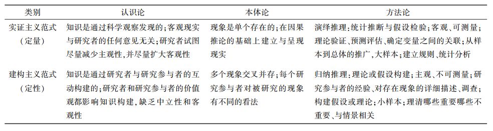 建构主义范式由德国社会学家韦伯和哲学家康德等人提出。与实证主义观点相反,建构主义范式代表了另外一种理解世界的方式,这种观点通常被认为是一种定性研究方法。根据建构主义观点,个体并不是被动地接受知识,而是通过与他人和我们于现实世界里相互交流来积极地构建知识,并揭示和理解个体所在的现实世界,从而产生有意义的知识。