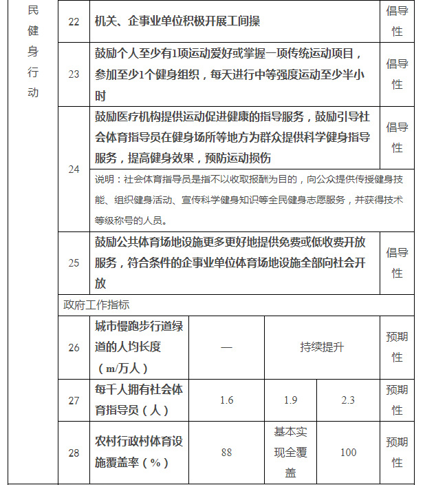 提倡机关、企事业单位开展工间操;鼓励个人至少有1项运动爱好或掌握1项传统运动项目,参加至少1个健身组织,每天进行中等强度运动至少半小时;鼓励医疗机构提供运动促进健康的指导服务,鼓励引导社会体育指导人员在健身场所等地方为群众提供科学健身指导服务,提高健身效果,预防运动损伤;鼓励公共体育场地设施更多更好地提供免费或低收费开放服务,确保符合条件的企事业单位体育场地设施全部向社会开放。