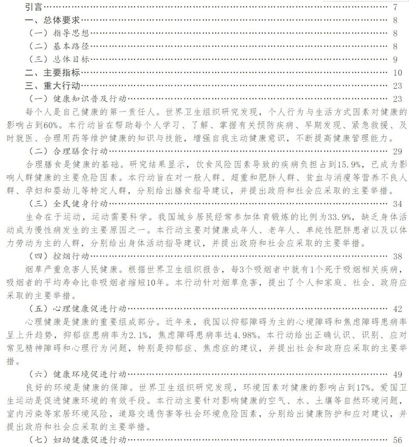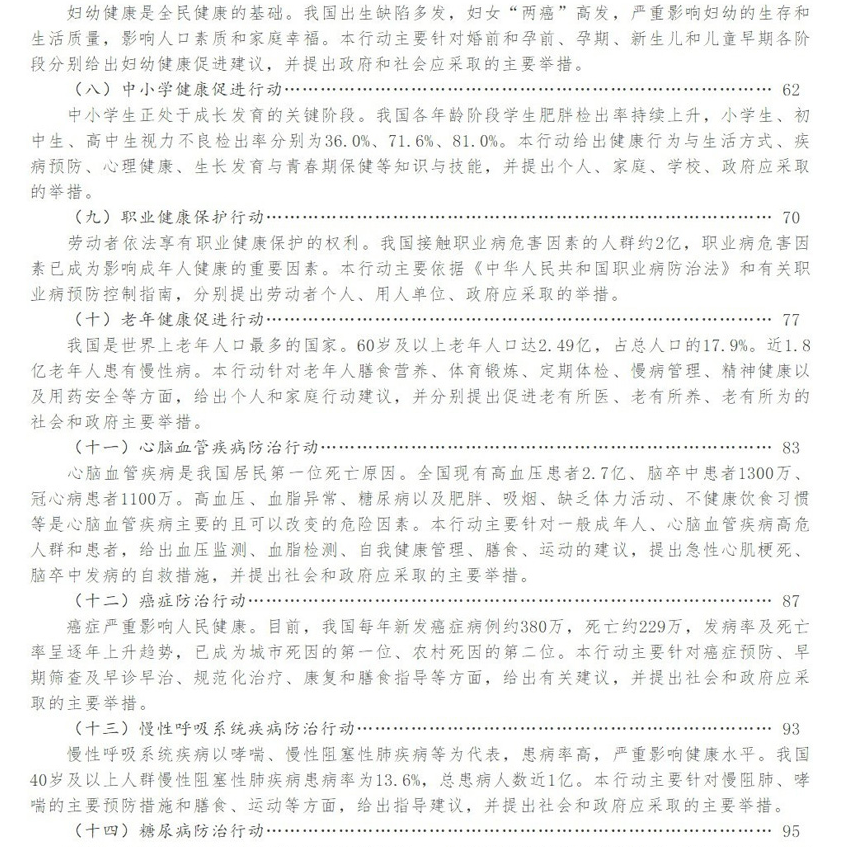 人民健康是民族昌盛和国家富强的重要标志。党的十八大以来,我国卫生健康事业取得新的显著成绩,医疗卫生服务水平大幅提高,居民主要健康指标总体优于中高收入国家平均水平。随着工业化、城镇化、人口老龄化发展及生态环境、生活行为方式变化,慢性非传染性疾病(以下简称慢性病)已成为居民的主要死亡原因和疾病负担。心脑血管疾病、癌症、慢性呼吸系统疾病、糖尿病等慢性病导致的负担占总疾病负担的70%以上,成为制约健康预期寿命提高的重要因素。同时,肝炎、结核病、艾滋病等重大传染病防控形势仍然严峻,精神卫生、职业健康、地方病等问题不容忽视,重大安全生产事故和交通事故时有发生。党的十九大作出了实施健康中国战略的重大决策部署,充分体现了对维护人民健康的坚定决心。为积极应对当前突出健康问题,必须关口前移,采取有效干预措施,努力使群众不生病、少生病,提高生活质量,延长健康寿命。这是以较低成本取得较高健康绩效的有效策略,是解决当前健康问题的现实途径,是落实健康中国战略的重要举措。为此,特制定《健康中国行动(2019—2030年)》(以下简称《健康中国行动》)。