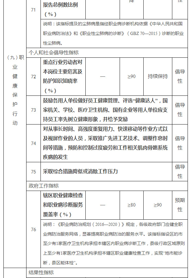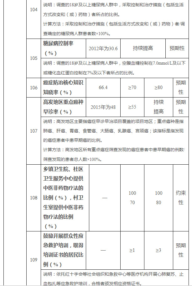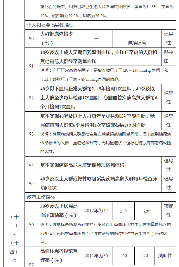 到2022年,覆盖经济社会各相关领域的健康促进政策体系基本建立,全民健康素养水平稳步提高,健康生活方式加快推广,心脑血管疾病、癌症、慢性呼吸系统疾病、糖尿病等重大慢性病发病率上升趋势得到遏制,重点传染病、严重精神障碍、地方病、职业病得到有效防控,致残和死亡风险逐步降低,重点人群健康状况显著改善。