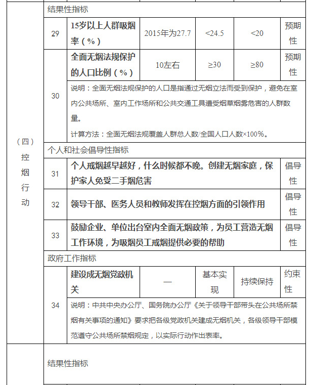 到2022年和2030年, 15岁以上人群吸烟率分别低于24.5%和20%;全面无烟法规保护的人口比例分别达到30%及以上和80%及以上;把各级党政机关建设成无烟机关,逐步在全国范围内实现室内公共场所、室内工作场所和公共交通工具全面禁烟;将违反有关法律法规向未成年人出售烟草的商家、发布烟草广告的企业和商家,纳入社会诚信体系“黑名单”,依法依规实施联合惩戒。