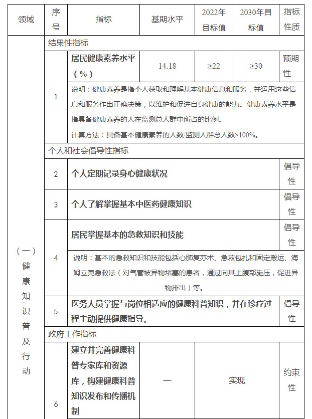 到2022年和2030年,全国居民健康素养水平分别不低于22%和30%,其中:基本知识和理念素养水平、健康生活方式与行为素养水平、基本技能素养水平分别提高到30%、18%、20%及以上和45%、25%、30%及以上,居民基本医疗素养、慢性病防治素养、传染病防治素养水平分别提高到20%、20%、20%及以上和28%、30%、25%及以上;人口献血率分别达到15‰和25‰;建立并完善健康科普专家库和资源库,构建健康科普知识发布和传播机制;中央广电总台对公益性健康节目和栏目,在时段、时长上给予倾斜保障;建立医疗机构和医务人员开展健康教育和健康促进的绩效考核机制;医务人员掌握与岗位相适应的健康科普知识,并在诊疗过程中主动提供健康指导;中医医院设置治未病科室比例分别达到90%和100%。鼓励各主要媒体网站和商业网站开设健康科普栏目。提倡个人定期记录身心健康状况;了解掌握基本中医药健康知识;掌握基本的急救知识和技能。
