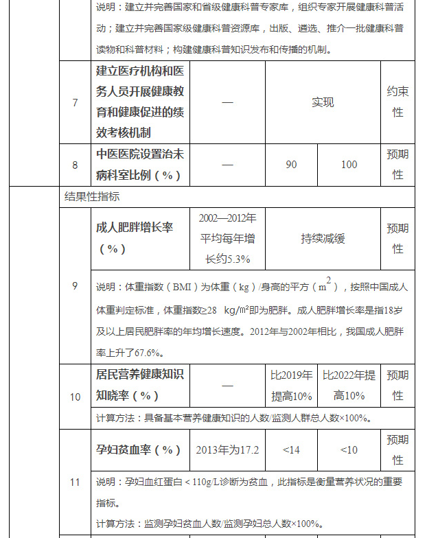 到2022年和2030年,成人肥胖增长率持续减缓;居民营养健康知识知晓率分别在2019年基础上提高10%和在2022年基础上提高10%;5岁以下儿童生长迟缓率分别低于7%和5%、贫血率分别低于12%和10%,孕妇贫血率分别低于14%和10%;合格碘盐覆盖率均达到90%及以上;成人脂肪供能比下降到32%和30%;每1万人配备1名营养指导员;实施农村义务教育学生营养改善计划和贫困地区儿童营养改善项目;实施以食品安全为基础的营养健康标准,推进营养标准体系建设。