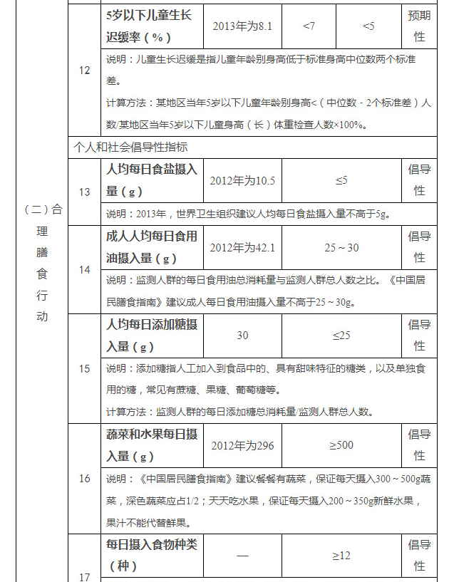 合理膳食是保证健康的基础。近年来,我国居民营养健康状况明显改善,但仍面临营养不足与过剩并存、营养相关疾病多发等问题。2012年调查显示,我国居民人均每日食盐摄入量为10.5g(世界卫生组织推荐值为5g);居民家庭人均每日食用油摄入量42.1g(《中国居民膳食指南》(以下简称《膳食指南》)推荐标准为每天25~30g);居民膳食脂肪提供能量比例达到32.9%(《膳食指南》推荐值上限为30.0%)。目前我国人均每日添加糖(主要为蔗糖即“白糖”、“红糖”等)摄入量约30g,其中儿童、青少年摄入量问题值得高度关注。2014年调查显示,3~17岁常喝饮料的儿童、青少年,仅从饮料中摄入的添加糖提供的能量就超过总能量的5%,城市儿童远远高于农村儿童,且呈上升趋势(世界卫生组织推荐人均每日添加糖摄入低于总能量的10%,并鼓励控制到5%以下或不超过25g)。与此同时,2010~2012年,我国成人营养不良率为6%;2013年,5岁以下儿童生长迟缓率为8.1%,孕妇、儿童、老年人群贫血率仍较高,钙、铁、维生素A、维生素D等微量营养素缺乏依然存在,膳食纤维摄入明显不足。