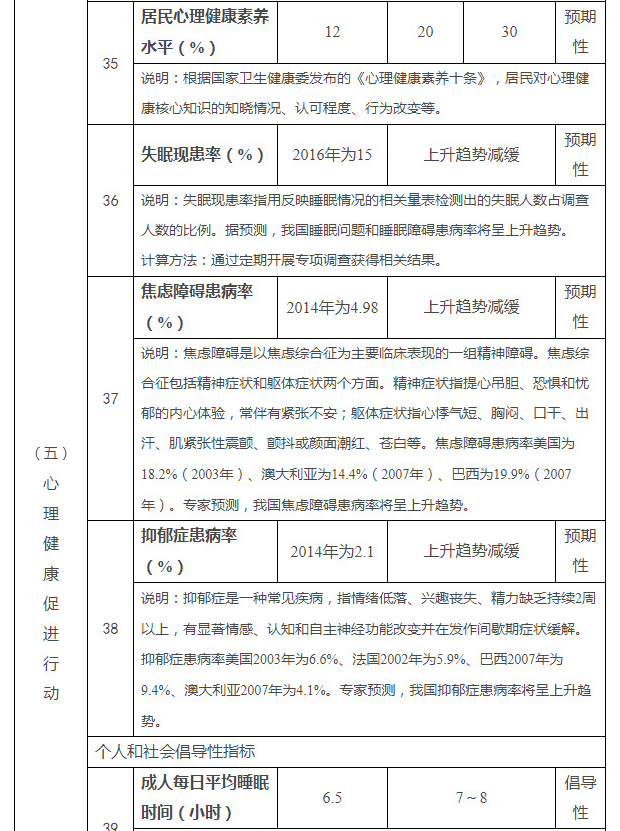 到2022年和2030年,居民心理健康素养水平提升到20%和30%;失眠现患率、焦虑障碍患病率、抑郁症患病率上升趋势减缓;每10万人口精神科执业(助理)医师达到3.3名和4.5名;抑郁症治疗率在现有基础上提高30%和80%;登记在册的精神分裂症治疗率达到80%和85%;登记在册的严重精神障碍患者规范管理率达到80%和85%;建立精神卫生医疗机构、社区康复机构及社会组织、家庭相互衔接的精神障碍社区康复服务体系,建立和完善心理健康教育、心理热线服务、心理评估、心理咨询、心理治疗、精神科治疗等衔接合作的心理危机干预和心理援助服务模式。