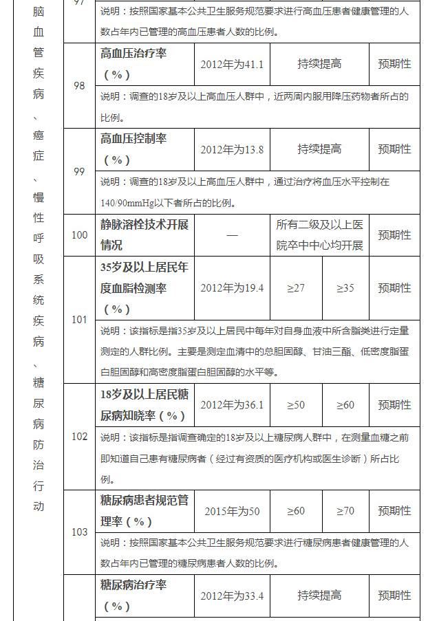 到2022年和2030年,心脑血管疾病死亡率分别下降到209.7/10万及以下和190.7/10万及以下;30岁及以上居民高血压知晓率分别不低于55%和65%;高血压患者规范管理率分别不低于60%和70%;高血压治疗率、控制率持续提高;所有二级及以上医院卒中中心均开展静脉溶栓技术;35岁及以上居民年度血脂检测率不低于 27%和35%;乡镇卫生院、社区卫生服务中心提供6类以上中医非药物疗法的比例达到100%,村卫生室提供4类以上中医非药物疗法的比例分别达到70%和80%;鼓励开展群众性应急救护培训,取得培训证书的人员比例分别提高到1%及以上和3%及以上。