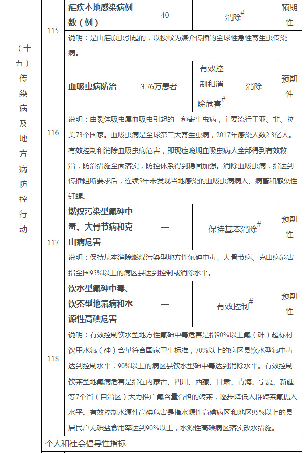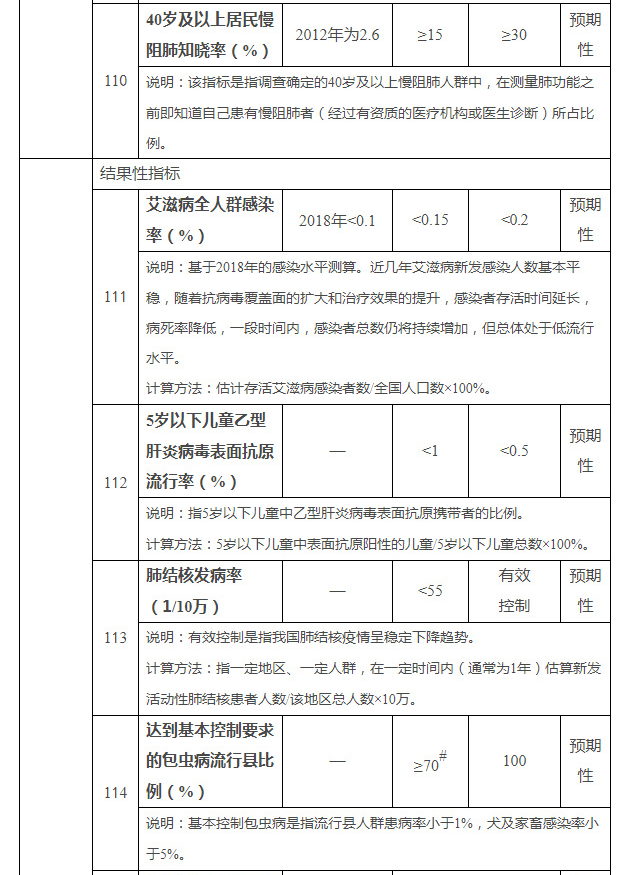 到2022年和2030年,艾滋病全人群感染率分别控制在0.15%以下和0.2%以下;5岁以下儿童乙型肝炎病毒表面抗原流行率分别控制在1%和0.5%以下;肺结核发病率下降到55/10万以下,并呈持续下降趋势;以乡(镇、街道)为单位,适龄儿童免疫规划疫苗接种率保持在90%以上;法定传染病报告率保持在95%以上;到2020年消除疟疾并持续保持;到2022年有效控制和消除血吸虫病危害,到2030年消除血吸虫病;到2022年70%以上的流行县人群包虫病患病率在1%以下,到2030年所有流行县人群包虫病患病率在1%以下;到2020年持续消除碘缺乏危害;到2022年基本消除燃煤污染型氟砷中毒、大骨节病和克山病危害,有效控制饮水型氟砷中毒、饮茶型地氟病和水源性高碘危害;到2030年保持控制和消除重点地方病,地方病不再成为危害人民健康的重点问题。
