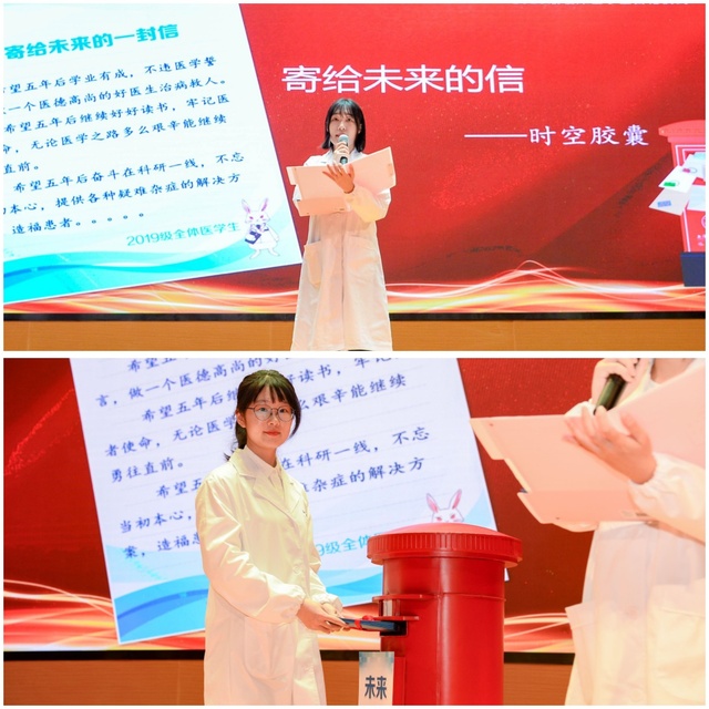 授袍仪式环节,黄钢校长、唐红梅校长等15位老师亲自将洁白而神圣的白大褂授予医学生代表。全体医学生一起在庄重和严肃的气氛中,郑重穿上白大褂、整理好衣扣,在附属周浦医院临床医学内科学系执行主任张进安教授的带领下,右手握拳,庄严宣誓医学生誓言。白袍加身,使命传承,矢志誓言,铿锵有力,医学生们以积极昂扬的精神面貌,表达了献身医学的决心与不懈奋斗的信念,在这神圣的专业仪式教育中完成了精神洗礼和角色转变,向医学专业学习生涯迈出了第一步。同学们带着对未来的展望,将写给五年后自己的一封信投入“时空胶囊”。