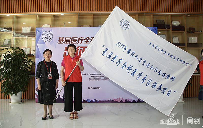 在上海健康医学院举办的出征仪式上,学校党委书记郑沈芳和副校长沈国芳为“基层医疗全科医学专家服务项目”团队、“临床服务专家组”、“基层全科医师培训专家组”、“健康与疾病预防宣教专家组”授旗。