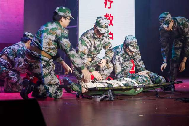 本次军事技能比武大赛,我校作为上海市唯一一所参加展示的医学院校,在校学工部的支持和浦东新区人民医院急症科万健主任、诸海军副主任医师的指导下,给予7名在读急救班医学生系统的培训和指导。战场医疗救护技术包括止血、包扎、固定、搬运、心肺复苏术等,学生按照模拟战地情景,生动演绎了战地现场伤员的紧急医疗救护。剧情中,两名队员在战火中负伤,分别致头部外伤及下肢骨折。其余五名队友在相互掩护后,将伤员转移至掩体后方相对安全区域,利用他们的专业战地急救技术对伤员进行初步止血、包扎及固定,同时完成安全转运。战地现场医疗救护的意义在于,可有效减少伤员的死亡及致残率,提升战斗力,巩固战斗意志。