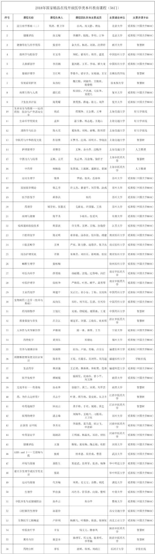 2018年国家精品在线开放医学类本科教育课程(56门)