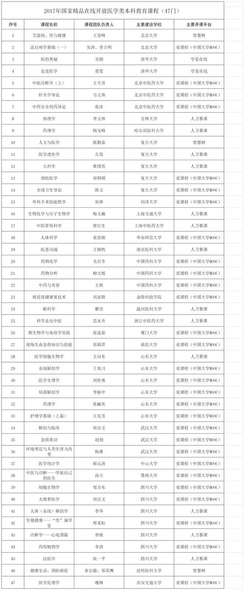 2017年国家精品在线开放医学类本科教育课程(47门)