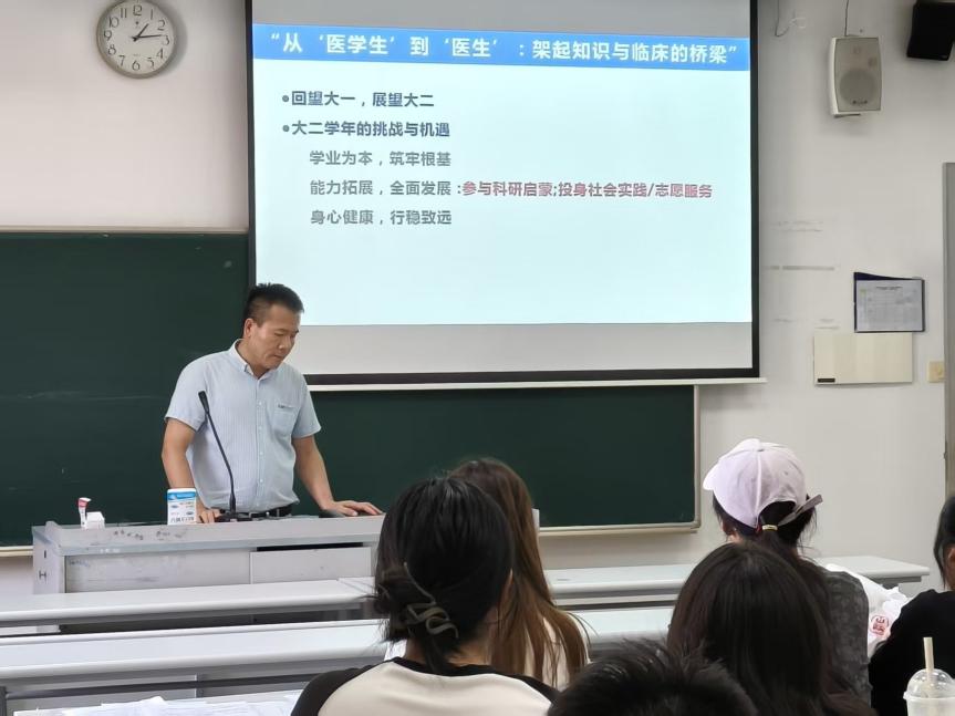 在2024级临床医学(本科)4、5班的班会中,班导师吴学平老师聚焦大二这一“承上启下”的关键学段,引导学生从被动接收转为主动建构,重视学科串联与知识整合。他通过“从‘医学生’到‘医生’”主题PPT,强调大二基础学科是未来临床课程的基石,鼓励同学们善用各类学习资源与工具,积极参与学科竞赛与科研训练,全面提升综合素质。面对学生提出的时间管理难题,他建议“优化规划、提升效率、立即行动”,并特别强调了思想教育与专业学习并重,期望同学们德才兼备,全面发展。