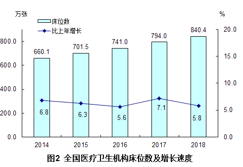 (二)床位数。2018年末,全国医疗卫生机构床位840.4万张,其中:医院652.0万张(占77.6%),基层医疗卫生机构158.4万张(占18.8%)。医院中,公立医院床位占73.7%,民营医院床位占26.3%。与上年比较,床位增加46.4万张,其中:医院床位增加39.9万张,基层医疗卫生机构床位增加5.5万张。每千人口医疗卫生机构床位数由2017年5.72张增加到2018年6.03张。