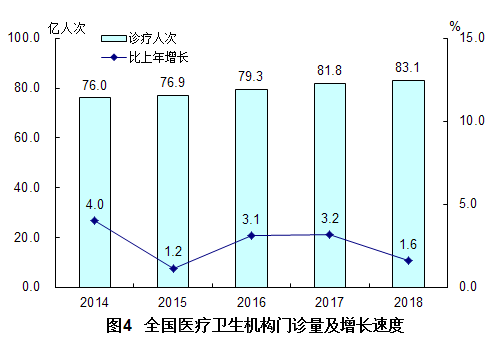 (一)门诊和住院量。2018年,全国医疗卫生机构总诊疗人次达83.1亿人次,比上年增加1.3亿人次(增长1.6%)。2018年居民到医疗卫生机构平均就诊6.0次。