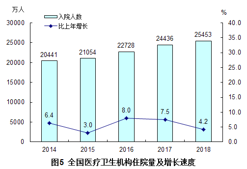 2018年,全国医疗卫生机构入院人数25453万人,比上年增加1017万人(增长4.2%),年住院率为18.2%。