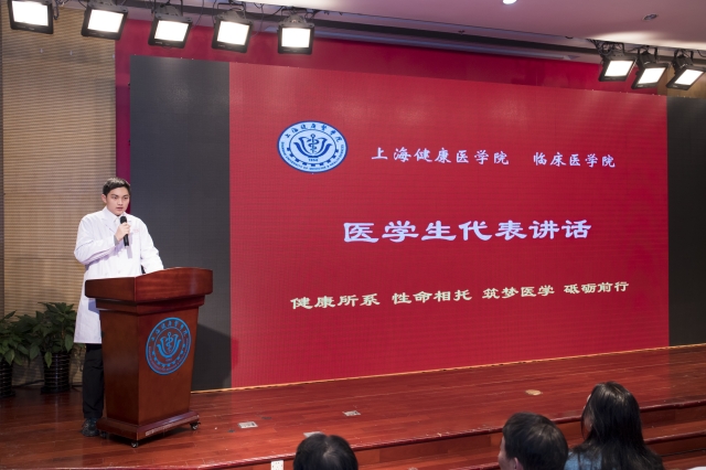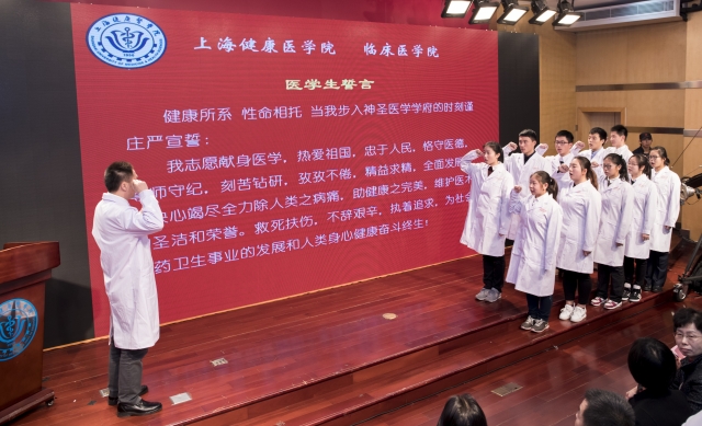 接下来开始授袍仪式,在庄严浑厚的音乐声中,新生依次走上讲台,副校长曹蓉蓉、副校长唐红梅,院长蔡巧玲、副院长秦啸龙以及附属医院班导师屠春林教授等十名教师代表为新生授予白大衣,同学们穿好后师长们微笑着帮他们整理仪容,同学们也从师长们的眼中读出了深切的关怀与深厚的期望。之后进入医学生宣誓环节,浦东新区人民医院万健主任领读誓词,临床医学院104名学生高举右拳,庄严宣誓:“健康所系,性命相托。当我步入神圣医学学府的时刻,谨庄严宣誓,我志愿献身医学,热爱祖国,忠于人民,恪守医德……”铿锵有力的誓言让临医学子们感受到了作为一名医学生所应承担的责任和使命,培养了同学们的职业归属感、责任感和荣誉感,标志着学生医学职业身份的确立、职业生涯的启程。