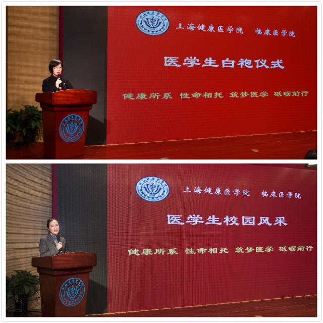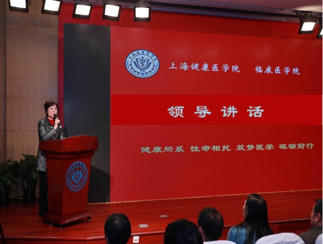 仪式最后,曹蓉蓉副校长总结讲话,对临床医学院的发展表示了充分肯定与赞赏,同时对同学们提出了殷切期望,鼓励临床学子们在五年的学习生涯中博极医源、精勤不倦,做一个有温度有情怀的医生,在夯实医学知识基础的同时,能够注重培养自身博学笃行、厚德仁心的职业精神和人文素养。希望同学们把百姓的健康梦转化为自己的青春梦,让治病救人的信念如一座灯塔指引同学们勇敢、执着、努力、奋进,不畏艰难,砥砺前行,让勤奋学习成为青春飞扬的动力,让增长本领成为青春搏击的正能量,让自己成为优秀的医生,终身为人民的健康事业做出贡献!