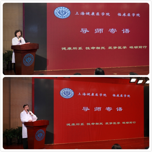 唐红梅副校长宣读首批临床导师名单,并作为班导师发表了新生寄语,希望同学们牢记医学生誓词的神圣承诺,牢记肩上的责任与使命,成为百姓健康的守护者、筑起健康中国大坝的坚实的基石,她给同学们提了三点期望:因爱而始,坚定医学梦想,不忘初心;为爱前行,夯实事业基础,知难而上;医路扬爱,创造人生价值,在平凡的岗位上成就不平凡的人生。之后,嘉定区中心医院屠春林教授作为附属医院班导师讲话,希望同学们时刻牢记医学生誓词上所说的“健康所系、性命相托”的重任,并在今后的临床见习、实习和工作中去努力践行理想和誓言,孜孜不倦、精益求精、全面发展。