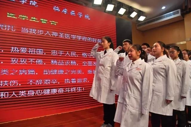 “健康所系,性命相托……我决心竭尽全力除人类之病痛,助健康之完美,维护医术的圣洁和荣誉!”昨天,上海健康医学院首批2016级临床医学专业100名本科生郑重地从师长手中接过白袍,穿上这身象征着职业圣洁与荣耀的白大褂,并举起右手庄严宣誓。