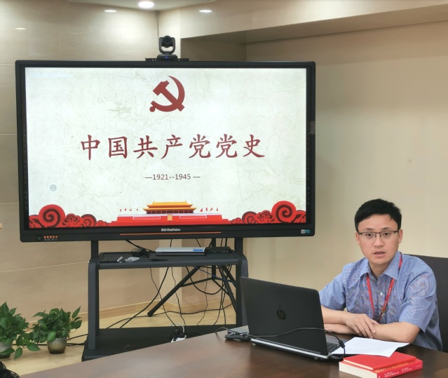 本次主题党日分为四个环节:首先由党总支副书记贺民同志带领学习党在新民主主义革命时期的历史。贺书记从党史发展脉络及学习意义入手,指出中国共产党史就是一部马克思主义在中国的传播史、一部与中国革命和具体实践相结合的马克思主义中国化的发展史。从党的一大到七大,详细阐释了每次大会召开的背景及重要意义,使全体党员同志认识到建党初期走过的艰难路程。