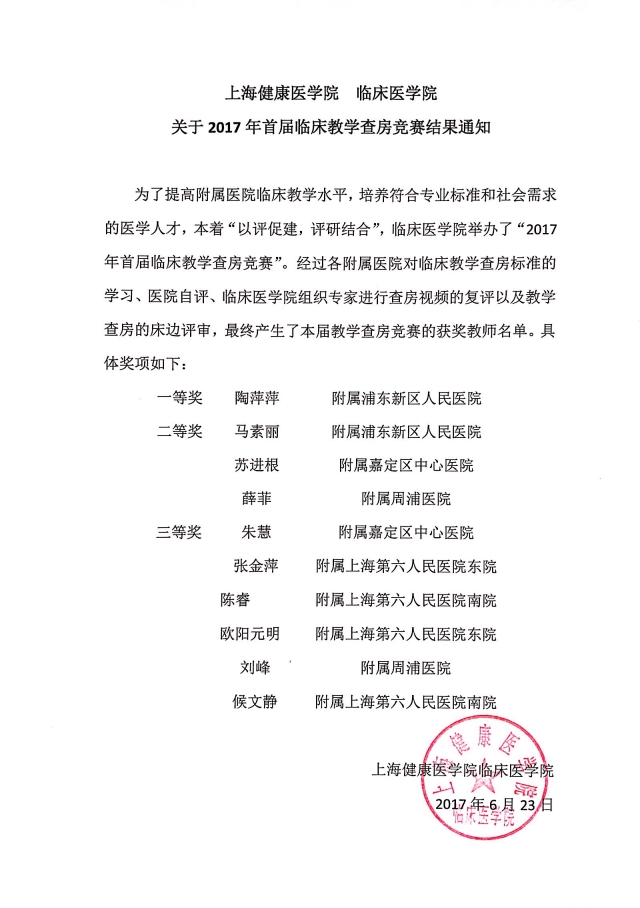 为了提高附属医院临床教学水平,培养符合专业标准和社会需求的医学人才,本着“以评促建,评研结合”,临床医学院举办了“2017年首届临床教学查房竞赛”。经过各附属医院对临床教学查房标准的学习、医院自评、临床医学院组织专家进行查房视频的复评以及教学查房的床边评审,最终产生了本届教学查房竞赛的获奖教师名单。具体奖项如下: