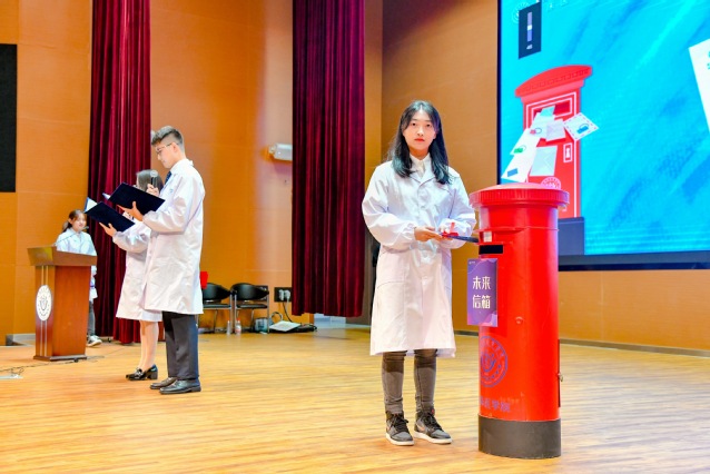 活动在庄严的国歌声中拉开帷幕。授袍仪式环节,唐红梅副校长、蔡巧玲院长、黄旭元院长等10位师者亲自将象征洁白、神圣的白袍授予医学生代表,为他们穿上白袍并整理衣领衣扣,送上嘱托。全体医学生一起在庄重和严肃的气氛中,穿上白袍、系好衣扣。在第六人民医院东院李虹主任的带领下,庄严宣誓医学生誓言。白袍加身,使命传承,矢志誓言,铿锵有力,医学生们以积极昂扬的精神面貌,表达了献身医学的决心与不懈奋斗的信念,在这神圣的专业仪式教育中完成了精神洗礼和角色转变,向医学专业学习生涯迈出了第一步。同学们带着对未来的展望,将写给五年后自己的一封信投入“时空胶囊”。相信在同学们的努力奋斗下,一定会成就未来更好的自己。