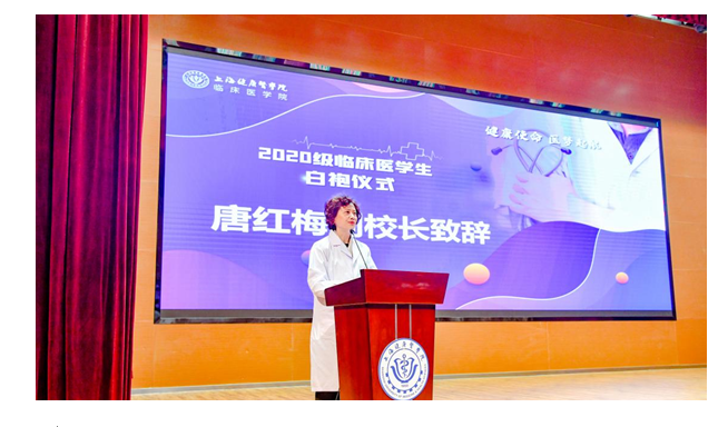唐红梅副校长最后发表了重要讲话。她首先对今天穿上白袍的290名临床医学专业同学表示祝贺。他从“上健医人”的担当与责任、伟大的抗疫实践、学校医学人文精神的探索、白袍仪式的意义等方面,说明白袍不仅是一种显性的责任,更是一种无穷的动力和终身需要追求的使命。今天师者为你们扣上“医学人生的第一粒纽扣”,意味着翻开了医学职业生涯的第一页,意味着“健康所系、性命相托”献身医学的人生正式起航,意味着从此扛起一个“上健医人”的担当与责任。选择了医学,就选择了温度、情怀和责任。希望同学们“莫失学医的初心、莫忘医者的使命”,不负白袍荣光,秉承伟大抗疫精神,满怀医学人文精神,为推进健康中国战略,推进国家医药卫生事业发展和人类身心健康,积极贡献力量,努力成为人民满意的、有温度的健康“守门人”!