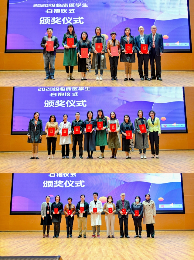 仪式开始前,临床医学院院长蔡巧玲发表了活动致辞,她从白袍仪式作为临床医学院的传统和今年2020年的特殊性谈起,希望同学们牢记白袍加身的使命和责任,以人民健康为目标,努力成为一名有温度的明日好医生,更好地服务人民、促进人类医疗卫生事业发展。会上,还对2020年临床医学院师德师风先进、第三届临床医学生“我心目中的好老师”进行了表彰。对2020级班导师进行了颁证并献上鲜花,仪式在全体师生大合影中落下帷幕。