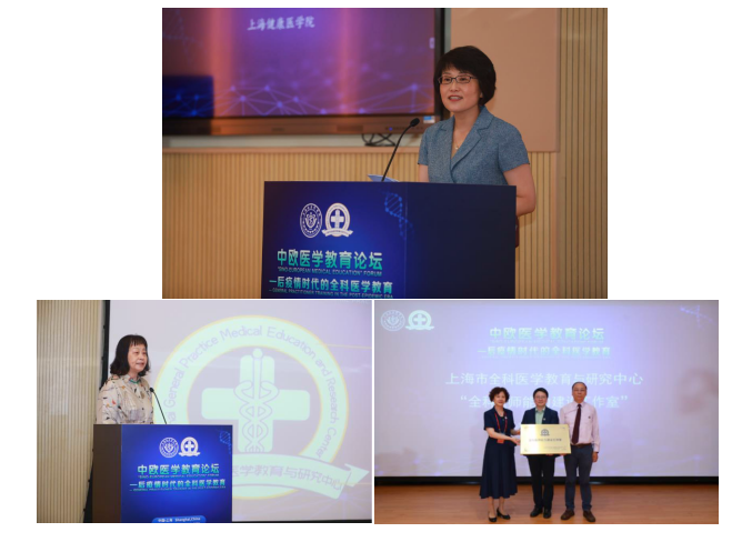 郑锦书记首先代表学校对参加本次研讨会的专家、学者、师生表示热烈的欢迎和诚挚的问候。她从新冠疫情的爆发谈起,指出及时、认真的审视医学教育中存在的薄弱环节,准确识别、科学应变、主动求变,对于后疫情时代推进医学教育更好更快的发展至关重要。上海市全科医学教育与研究中心主任祝墡珠教授对上海市全科医学教育与研究中心LOGO发布进行了释意,并宣布成立“全科医生能力建设工作室”。上海市卫健委二级巡视员张勘、上海健康医学院唐红梅副校长上台为工作室授牌,上海市浦东新区上钢社区卫生服务中心主任杜兆辉作为工作室主任上台接受授牌。