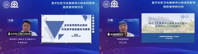 主旨报告环节由我院实践教学负责人叶熊老师主持。上海市浦东新区上钢社区卫生服务中心主任、我校特聘教授杜兆辉围绕社区教学基地建设、教学实践及特色以及疫情下社区教学三方面,做了关于全科医师规范化培训社区教学基地建设与探索的分享。附属周浦医院教学培训部、全科医学科主任沈艺介绍了带教学生过程中Mini-CEX的应用,探讨社区卫生服务中心开展Mini-CEX评估的背景与改良。